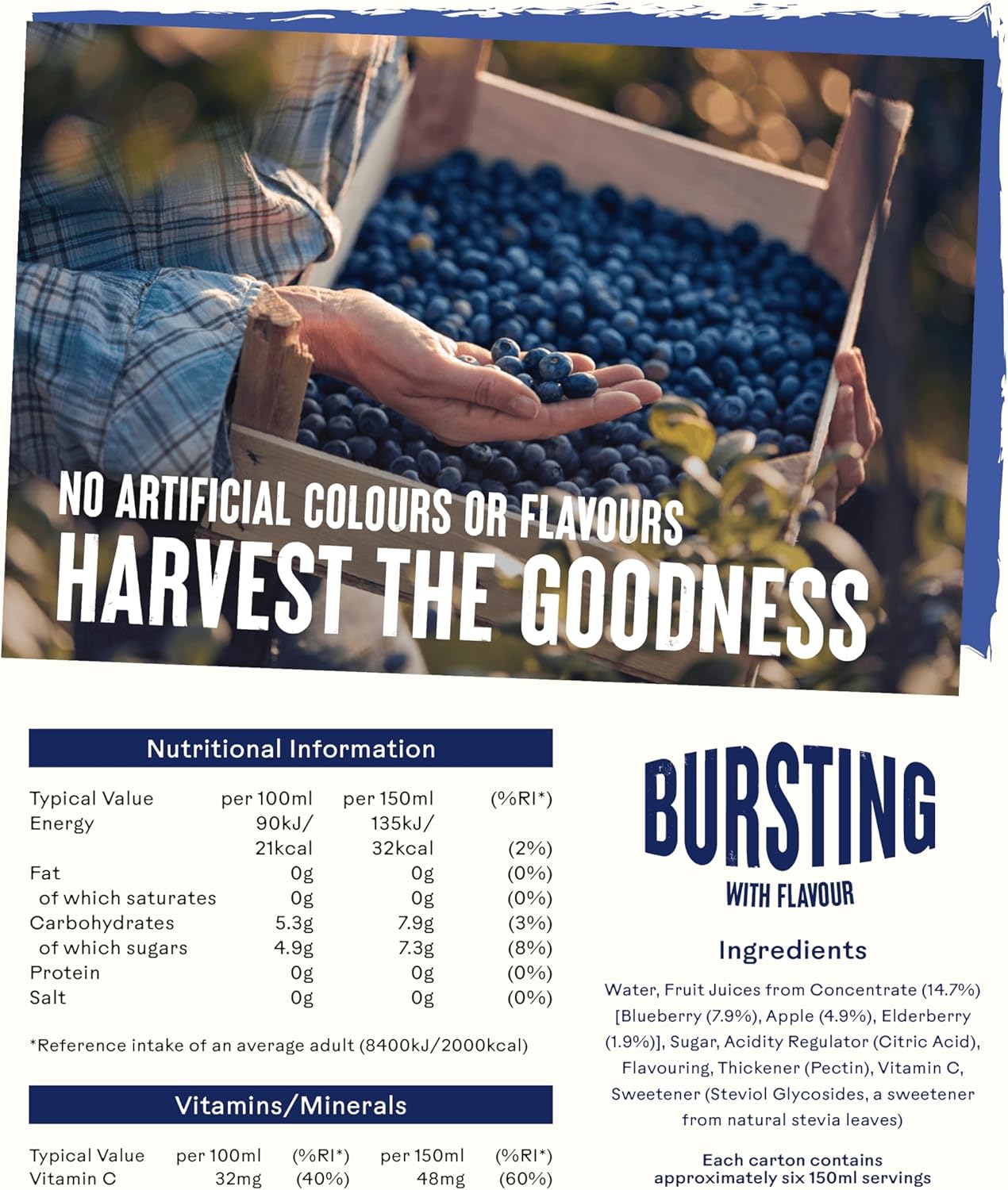 Water, Fruit Juices from Concentrate (15%) (Blueberry (8%), Apple (5%), Elderberry (2%)), Sugar, Citric Acid, Vitamin C, Flavouring, Thickener, Vitamin C, Sweetener (Steviol Glycosides).